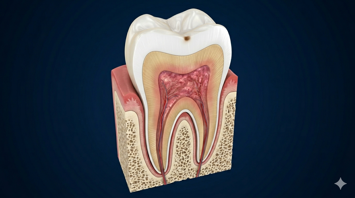 Su diente tiene una pequeña zona atacada por bacterias. Todavía no duele, pero si no se trata, la infección llegará al nervio y el tratamiento será 4 veces más largo y costoso. Hoy, una sola visita es suficiente.